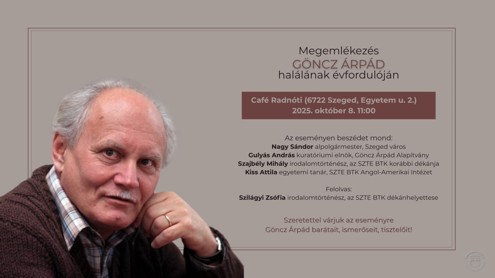 Emlékező beszédek: Szajbély Mihály irodalomtörténész, az SZTE BTK korábbi dékánja, Kiss Attila egyetemi tanár, Angol-Amerikai Intézet, Nagy Sándor alpolgármester, Gulyás András kuratóriumi elnök, Göncz Árpád Alapítvány